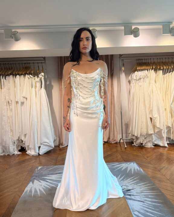 Rivista “Vogue” shkruan se për ditën e saj të veçantë, ylli i muzikës zgjodhi një fustan nusërie të dizenjuar posaçërisht nga marka legjendare “Vivienne Westwood”. Fustani me bust korse dhe vello përfaqësonte stilin klasik dhe elegant që e karakterizon Westwood-in, duke nxjerrë në pah format trupore të artistes.