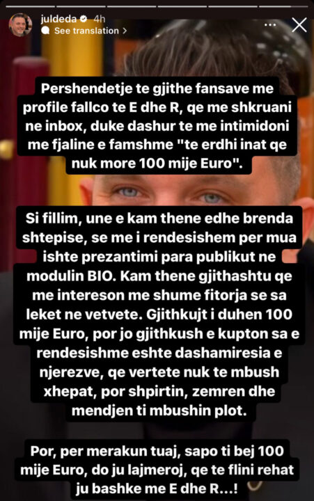 “Përshëndetje të gjithë fansave me profile fallco të E dhe R, që më shkruani në inbox, duke dashur të më intimidoni me fjalinë e famshme ” të erdhi inat që nuk more 100 mijë euro”.