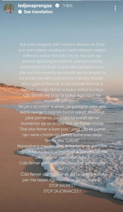 Ama duket se Ledjana e nuhati se emri i saj do përfshihej në këtë histori kështu që bëri ditën e sotme një reagim të shpejtë në Instastory. Ajo ka treguar se i vjen keq dhe se mban krahun e vajzës së dhunuar duke u shprehur se ajo nuk ka faj, por edhe se nuk ka pasur kontakt me Klean.