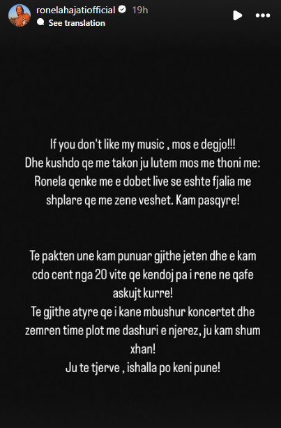 “Nëse nuk e pëlqen muzikën time, mos e dëgjo! Dhe kushdo që më takon, ju lutem mos më thoni më: Ronela qenke më e dobët live se është fjalia më e shpëlarë që më zënë veshët. Kam pasqyrë! Të paktën unë kam punuar gjithë jetën dhe e kam çdo cent nga 20 vite që këndoj pa i rënë në qafë askujt kurrë!”.