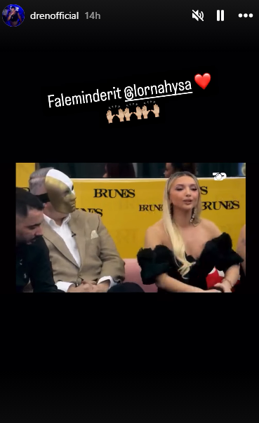 Ndërkohë Dreni ka publikuar në “Instastory” videon ku Lorna i uroi ditëlindjen dhe postimin e ka shoqëruar me fjalët: “Faleminderit Lorna” dhe me emoiji zemre dhe disa duar.