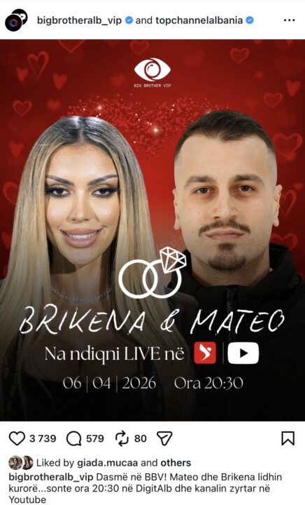 Ndërkohë në “Instagram” të BBV është bërë njoftimi i dasmës së Brikenës dhe Mateos: