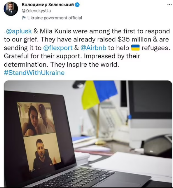 Presidenti Volodymyr Zelensky ka falënderuar Mila Kunis dhe Ashton Kutcher, pasi arritën që të mblidhnin rreth 35 milionë dollarë për të mbështetur refugjatët që po largohen nga Ukraina e shkatërruar nga lufta.
