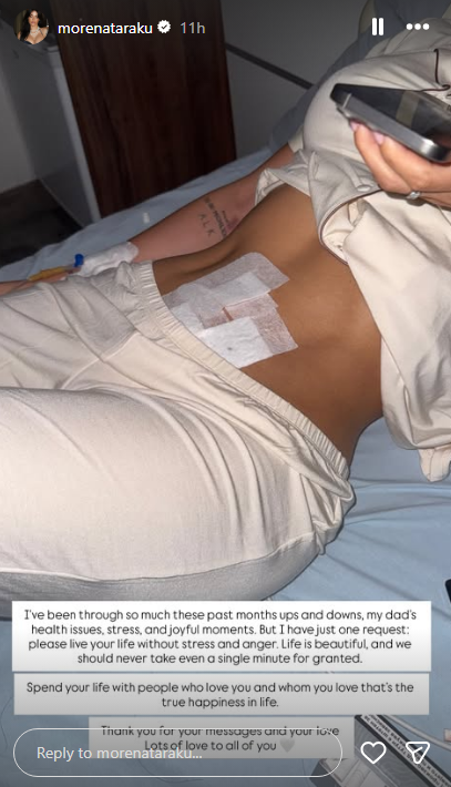 Në foton në fjalë, Morena tregon zonën e barkut të fashuar, duke mos dhënë detaje të tjera në lidhje me gjendjen e saj shëndetësore.