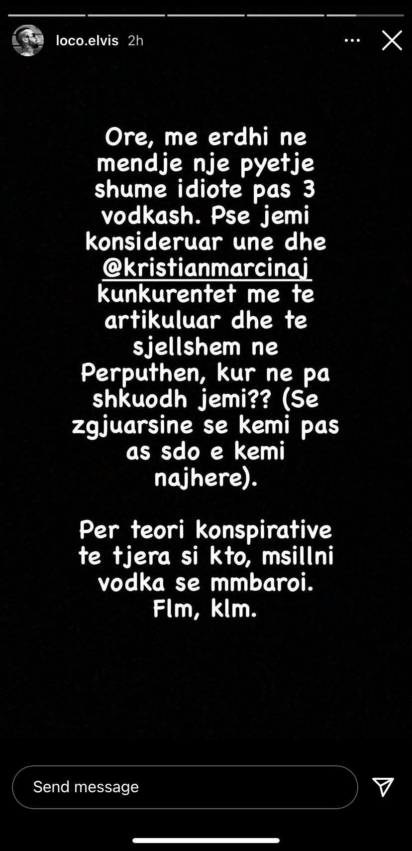 “Ore me erdhi ne mendje nje pyetje shume idiote pas 3 vodkash. Pse jemi konsideruar une dhe Kristian Marcinaj konkurentet me te artikuluar dhe sjellshem ne Perputhen, kur ne pa shkuodh jemi?? (Se zgjuarsine se kemi pas as sdo e kemi najhere). Per teori te tjera konspirative si kto, msillni vodka se mmbaroi. Flm, klm”, shkruan Elvisi.