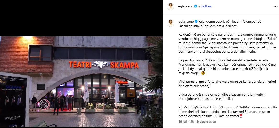 Kjo është një histori drejtorllëku por unë “luftën” e kam me skenën jo me drejtorllëkun, prandaj i mrekullueshmi Elbasan, të lutem prano dorëheqjen time. Ju kam në zemër”, është postimi i aktores së njohur në rrjetet sociale.