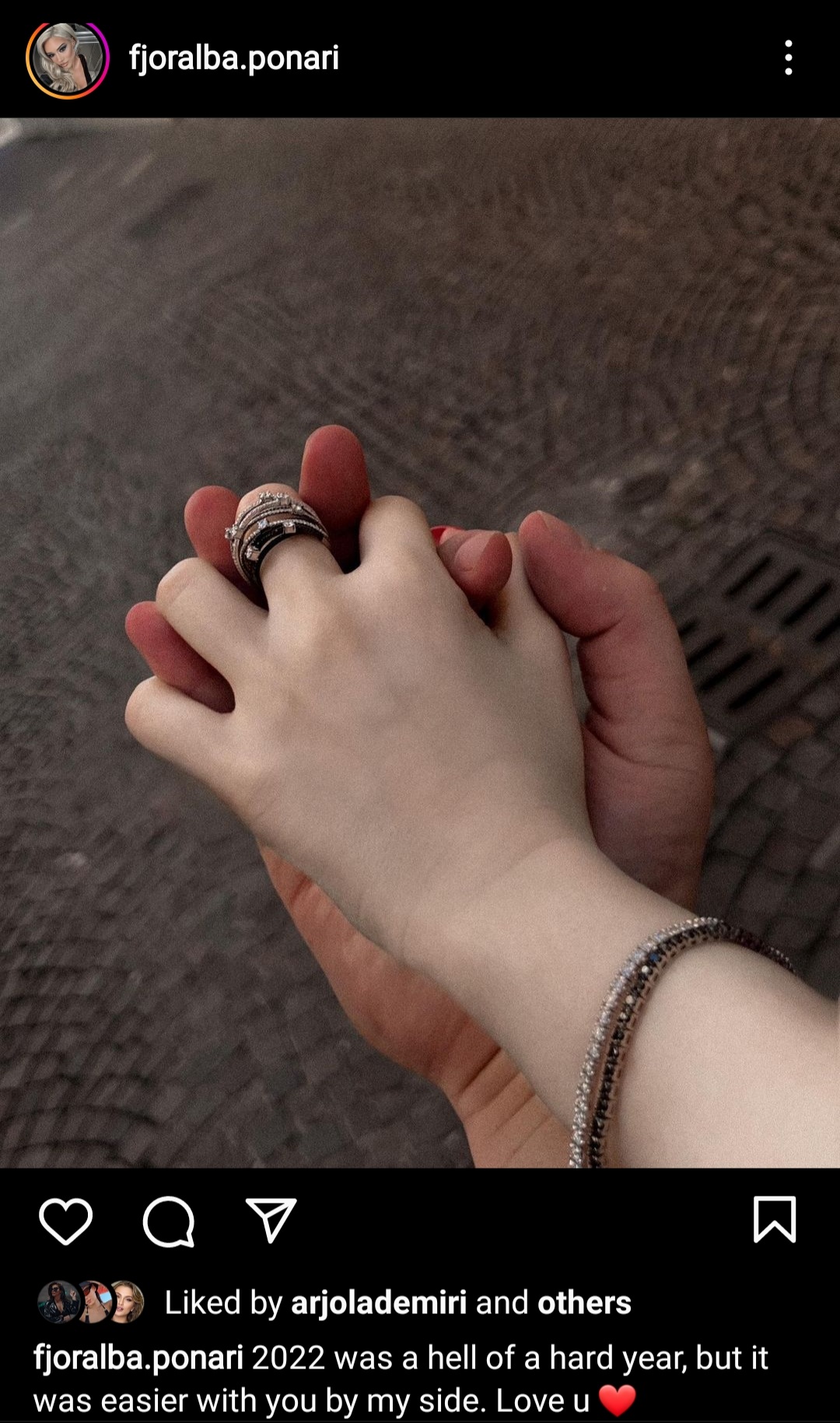 Fjoralba e mban shumë private lidhjen e saj dhe shumë rradhë herë poston foto me të dashurin e saj. Ditën e sotme bukuroshja ka postuar në Instagram një foto të dorës së saj dhe të tij të kapura fort me njëra-tjetrën dhe ka shkruar se si ka qenë ky vit për të.