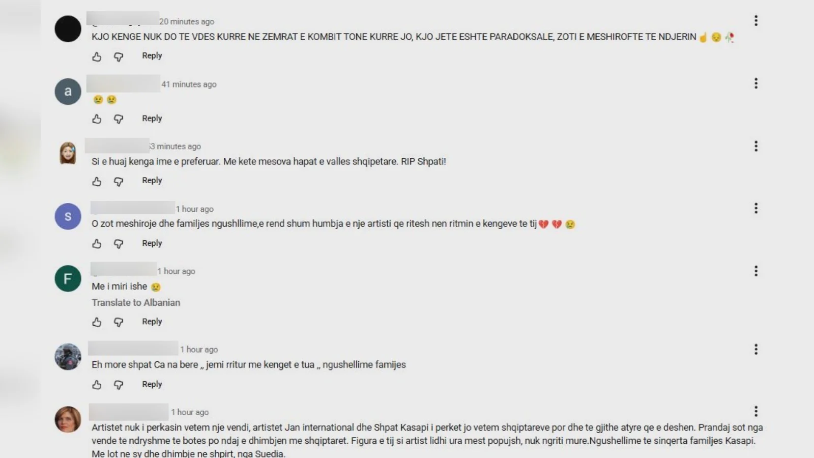 “Faleminderit Shpat Kasapi që na e bëre jetën më të lumtur e na dhe gëzim në jetët tona me këtë kryevepër. Mos të them që me këtë këngë falë teje disa njerëz jashtë Shqipërisë e njohin vendin tonë dhe madje këtu në Formosan e largët, duke iu treguar këngën tënde iu mësova për traditat shqiptare. Jeta është e pabesueshme ndonjëherë”-janë disa nga komentet.