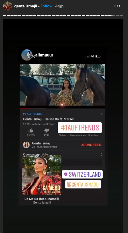 Madje duket se “Ça me bo” po dëgjohet edhe jashtë trojeve shqiptare. Genta ka zbuluar përmes një postimi në “Instastory” se kënga e saj është renditur e para në listën e projekteve “Trending” në Zvicër.