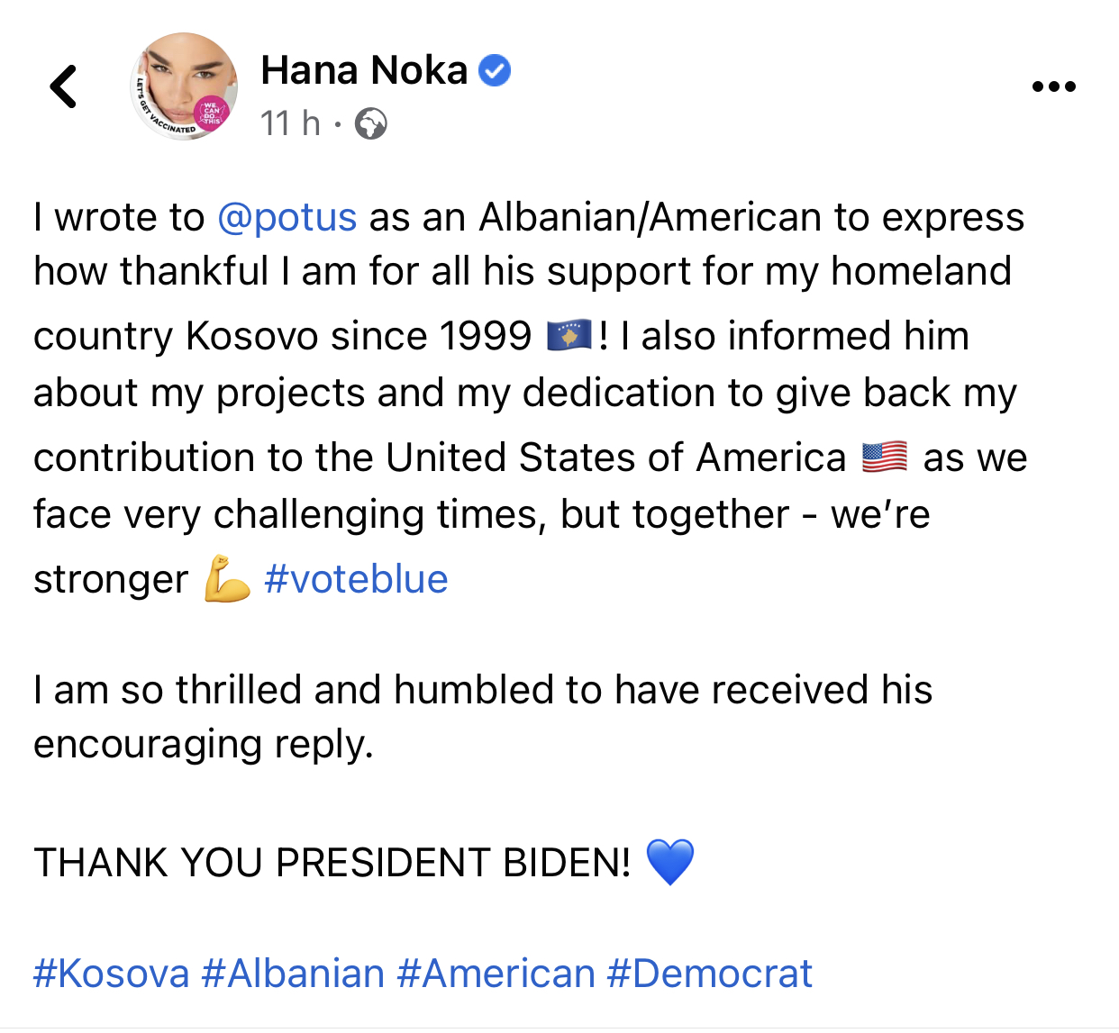 “I shkrova si një shqiptare/amerikane për të shprehur sa mirënjohëse jam për gjithë mbështetjen e tij për atdheun tim Kosovën që nga viti 1999! E informova edhe për projektet e mia dhe përkushtimin tim për të kthyer kontributin tim në Shtetet e Bashkuara të Amerikës pasi po përballemi me një kohë shumë sfiduese, por së bashku – jemi më të fortë”, shkruan Noka në rrjetet sociale.