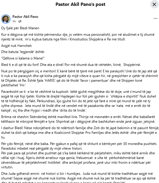 Gjatë fjalës së tij, Mane përmendi edhe pastorin Akil Pano, për të clin tha se i vjen keq për të.