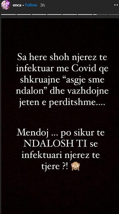 “Sa here shoh njerez te infektuar me Covid qe shkruajne “asgje sme ndalon” dhe vazhdojne jeten e perditshme…. Mendoj… po sikur te NDALOSH TI se infektuari n jerez te tjere?!”, shkroi ajo.