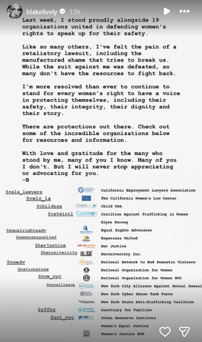 Një zëdhënës i saj theksoi se këto grupe janë bashkuar për të kundërshtuar përpjekjen e Justin Baldoni për të “shkatërruar një ligj që mbron gratë që ngrenë zërin, thjesht për të mbrojtur veten”.
