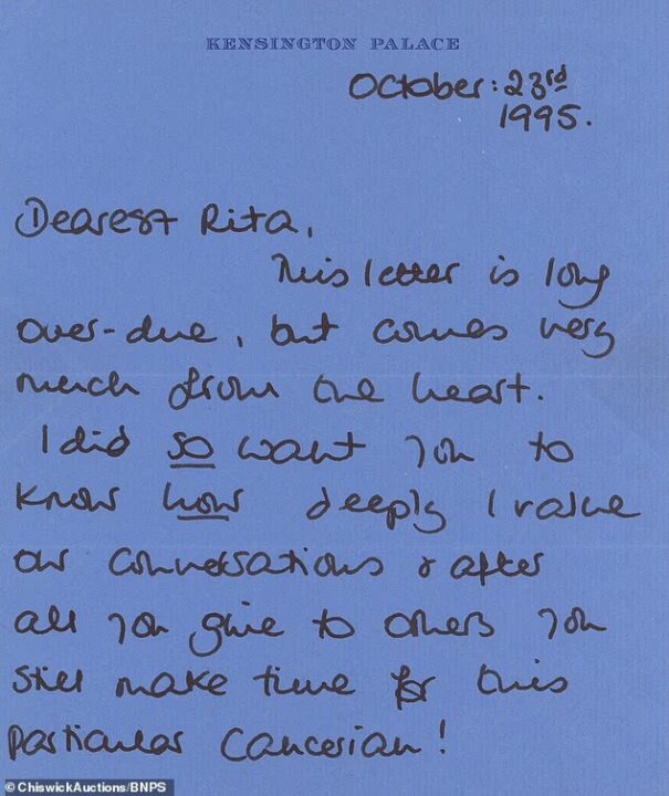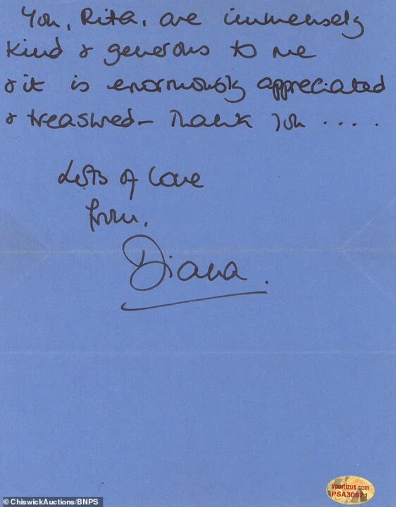 Në letrën e shkruar me dorë, Diana e falënderon Ritan për “mirësinë dhe bujarinë e jashtëzakonshme” dhe shton se miqësia e saj është “tepër e çmuar dhe e vlerësuar”.
