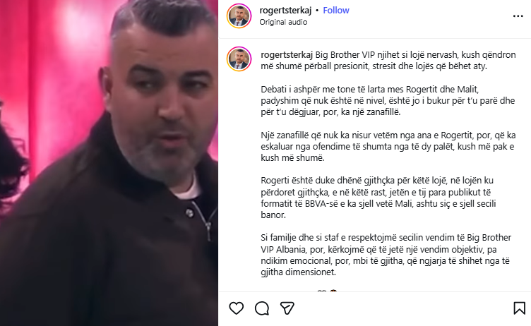 Në deklaratën e publikuar, familjarët pranojnë se debati mes Rogertit dhe Malit ka kaluar në tone të ashpra dhe jo të denja për t’u parë e dëgjuar, duke u shoqëruar me ofendime nga të dyja palët. Ata theksojnë se tensioni i krijuar është rezultat i presionit dhe stresit të lojës, e cila shpesh i çon banorët në reagime ekstreme.