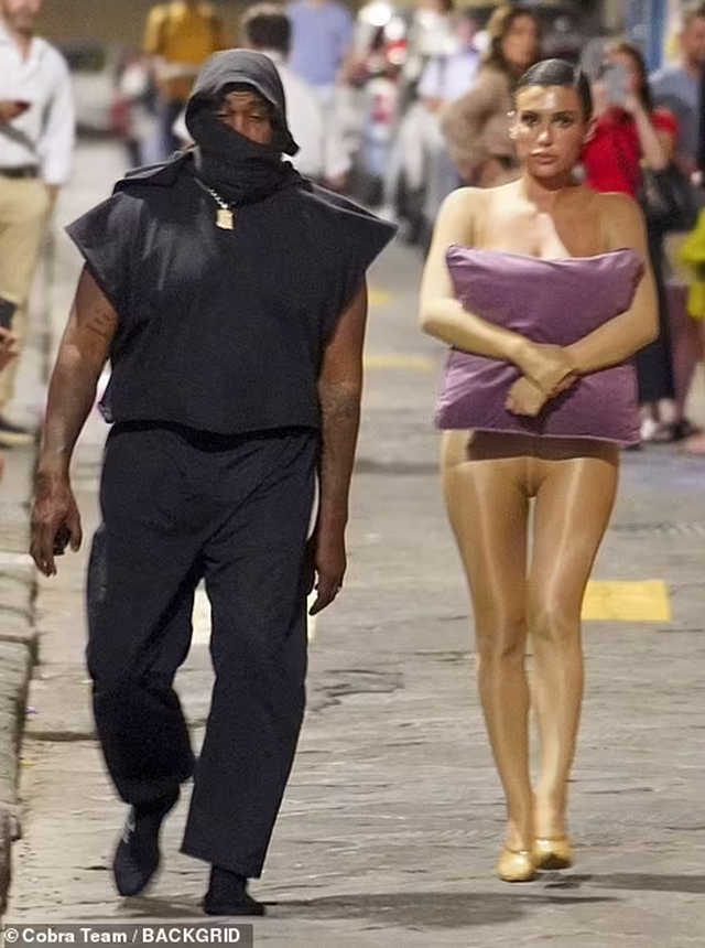 Së fundmi, bashkëshortja e reperit të njohur është fotografuar duke shëtitur nëpër Itali “topless”. Ajo mban në duar një jastëk, me të cilin mbulon gjoksin. Gjithashtu mban veshur edhe një palë geta ngjyrë nude.