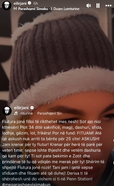 “Flutura jonë filloi të rikthehet mes nesh! Sot ajo nisi kthesën! Plot 34 ditë sakrificë, magji, dashuri, sfida, lodhje, gëzim, lot, frikëra! Por në fund: FITUAM! Atë që askush nuk arriti ta bënte për 25 vite! ASKUSH! Jam krenar për ty flutur! Krenar për herë të parë për veten time, sepse ishte thjesht dhe vetëm dashuria që kam për ty! Ti sot pate bekimin e Zotit dhe prindërve të tu që vdiqën me merak për ty! Shërim të shpejtë Flutura jonë rozë! Tani jam i qetë sepse sfiduam dhe fituam atë që duhej! Derisa ti të shërohesh unë do vishem si ti në Penn Station! #meparashqevisimakun”.