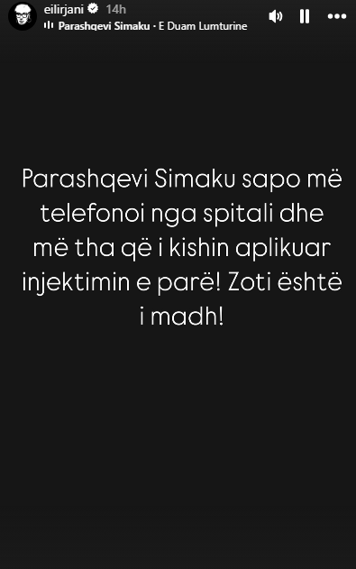 “Parashqevi Simaku sapo më telefonoi nga spitali dhe më tha që i kishin aplikuar injektimin e parë! Zoti eshtë i madh”, shkruan Ilirjani.