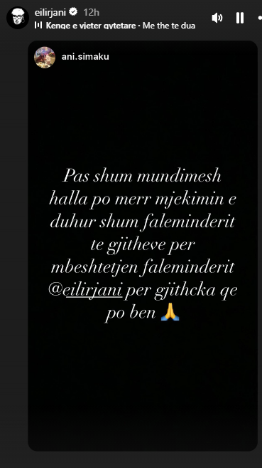 “Pas shumë mundimesh halla po merr mjekimin e duhur shumë faleminderit të gjithëve për mbështetjen , faleminderit @eilirjani për gjithçka që po bën”, ka shkruar mbesa e saj Ani Simaku në “Instastory”.