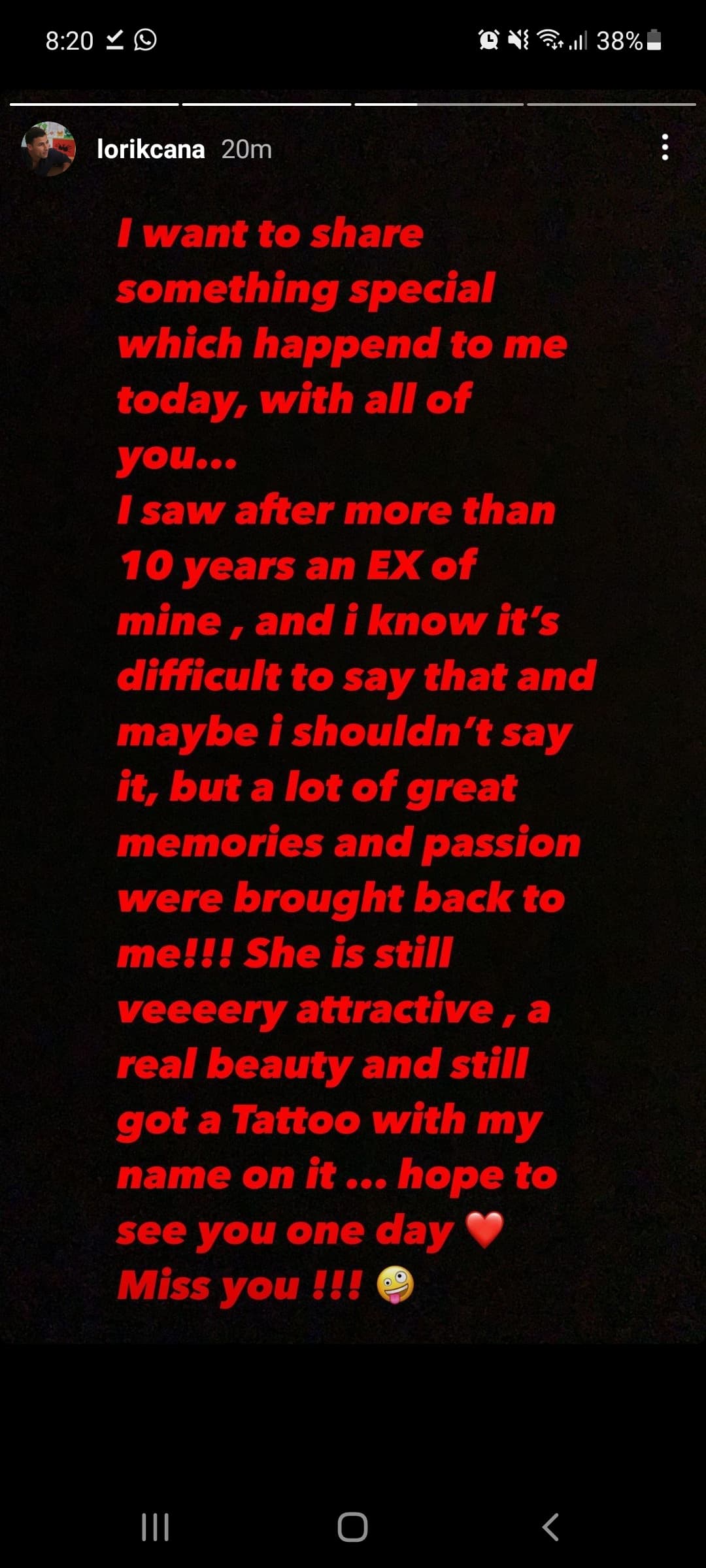 “Dua të ndaj diçka speciale me ju sot. Pashë ish-in tim pas më shumë se 10 vitesh. E di sa e vështirë është ta them, mbase edhe e gabuar, por shumë kujtime dhe pasion më kthyen pas në kohë. Ajo është akoma shumë tërheqëse dhe një bukuroshe e vërtetë. Madje ka akoma një tatuazh me emrin tim. Shpresoj të të shoh një ditë. Më mungon”, shkroi Loriku në postimin e tij.