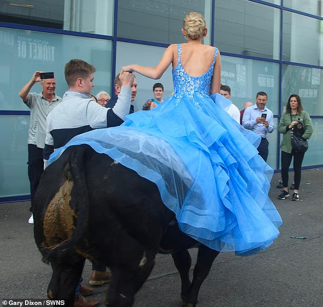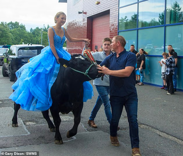 “Të gjithë kanë hipur mbi kuaj ose karroca, kështu që mendova që të bëja doçka krejtësisht ndryshe që askush nuk e kishte bërë më parë”, ka thënë Chloe Fitton për shfaqjen e saj mbi lopë në mbrëmjen e maturës.