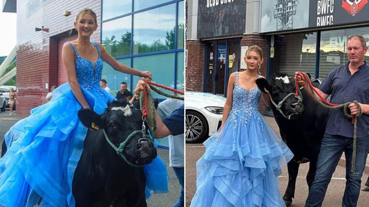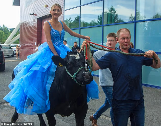 Vajza e një fermeri ka tërhequr gjithë vëmendjen teksa mbërriti në mbrëmjen e maturës mbi një lopë. Chloe Fitton mbante veshur një fustan të gjatë, ngjyrë blu dhe dukej shumë elegante. Por nuk ishte paraqitja e 15-vjeçares që ktheu vëmendjen nga ajo.