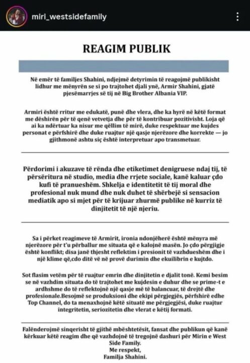 Së fundmi, familja e banorit të “BBV5”, Mirit ka publikuar një reagim zyrtar lidhur me mënyrën se si ai është trajtuar këngëtari gjatë qëndrimit të tij në shtëpinë më të famshme në Shqipëri. Në deklaratën e shpërndarë në rrjetet sociale, familja shpreh shqetësimin për akuzat dhe etiketimet që, sipas tyre, kanë tejkaluar kufijtë e pranueshëm, duke cënuar dinjitetin personal dhe profesional të Mirit.