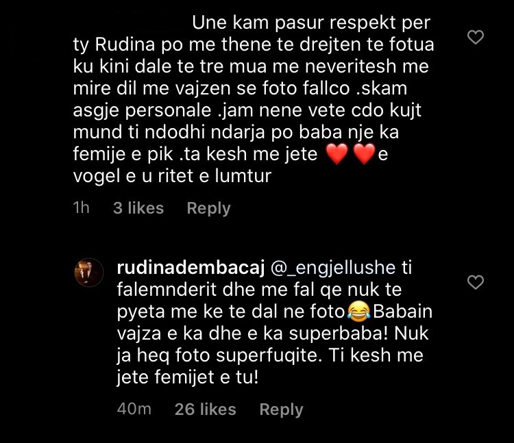 “Unë kam pasur respekt për ty Rudina, por me thënë të drejtën tek foto ku keni dalë të tre mua më neveritesh. Më mirë dil me vajzën, se foto fallco. S’kam asgjë personale. Jam nënë vetë, çdo kujt mund t’i ndodhi ndarja, por baba një ka fëmija dhe pikë. Ta kesh me jetë ❤❤e vogël të rritet e lumtur,”– shkroi një komentuese