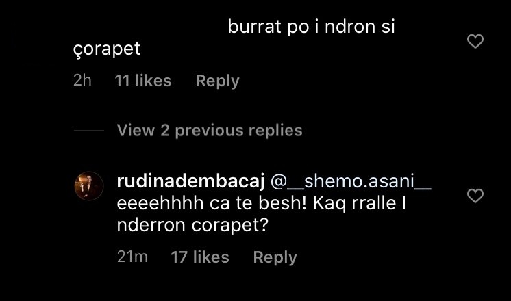 Ndërsa një tjetër i komentoi se po i ndërron burrat “si çorapet”. “Burrat po i ndërron si çorapet,”- i komentoi ndjekësi. “Eeeeehhhh çfarë të bësh! Kaq rrallë i ndërron çorapet?”– iu përgjigj ajo.