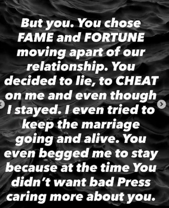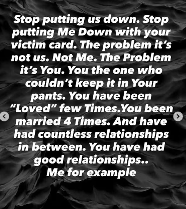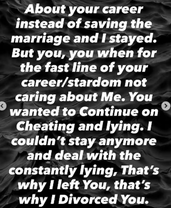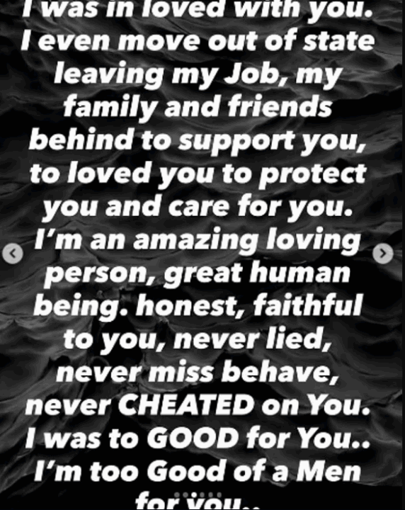 “Mjaft më nënçmove. Mjaft luajte rolin e viktimës. Problemi nuk jam unë, je ti”, shkroi ai, i cili shtoi se ka qenë një burrë besnik, i ndershëm dhe i dashur, që la gjithçka pas, punën, vendin dhe familjen, për ta ndjekur atë dhe për ta mbështetur në karrierën e saj.