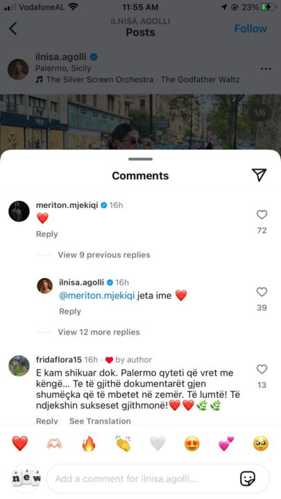 Në këtë postim ka gjithashtu edhe komente të shumta, por vëmendjen e merr sigurisht ai i Meritonit. Ky i fundit ka lënë në koment një emoji zemër të kuqe, të cilit Agolli i është përgjigjur: “Jeta ime”.