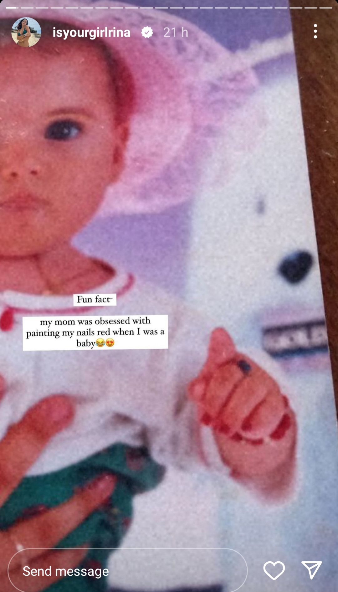 Ditën e sotme Rina duket se është bërë nostalgjike pasi ka postuar në Instastory një foto të saj, kur ka qenë një vajzë e vogël dhe me këtë rast na ka treguar një fakt për fëmijërinë e saj, që askush nuk e dinte. Kur ishte vetëm një bebe mamaja e saj ishte e fiksuar që t’ja lyente asaj thonjtë e kuq.