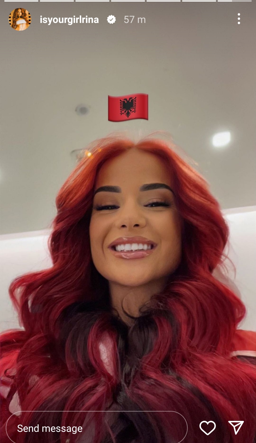 Rinën e kemi parë shpesh herë të eksperimentoj me ‘look-un’ sidomos me flokët e saj, ku së fundmi duket se bukuroshes i janë mërzitur flokët e saj të gjata ngjyrë portokalli. Me anë të një postimi në Instastory, Rina na ka treguar se ka bërë ndryshimin e rradhës, duke i kthyer flokët e saj në ngjyrë të kuqe që gjithashtu i shkojnë shumë këngëtares. E meqë jemi kaq afër festave të 28-29 Nëntorit, Rina ka postuar një foto të saj me flokët e kuqe dhe ka vendosur një figurë të flamurit shqiptar, duke e ngjasuar veten me flamurin e mesa duket këngëtarja qenka një vajzë shumë patriote.