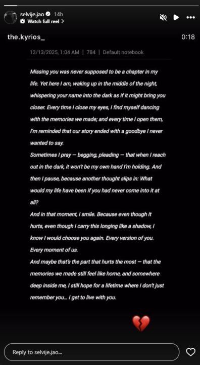 Dhe ndoshta kjo është pjesa që dhemb më shumë — që kujtimet që krijuam ende ndihen si shtëpi dhe, diku thellë brenda meje, ende shpresoj për një jetë ku nuk të kujtoj vetëm… por jetoj me ty.”, ka shkruar ajo.