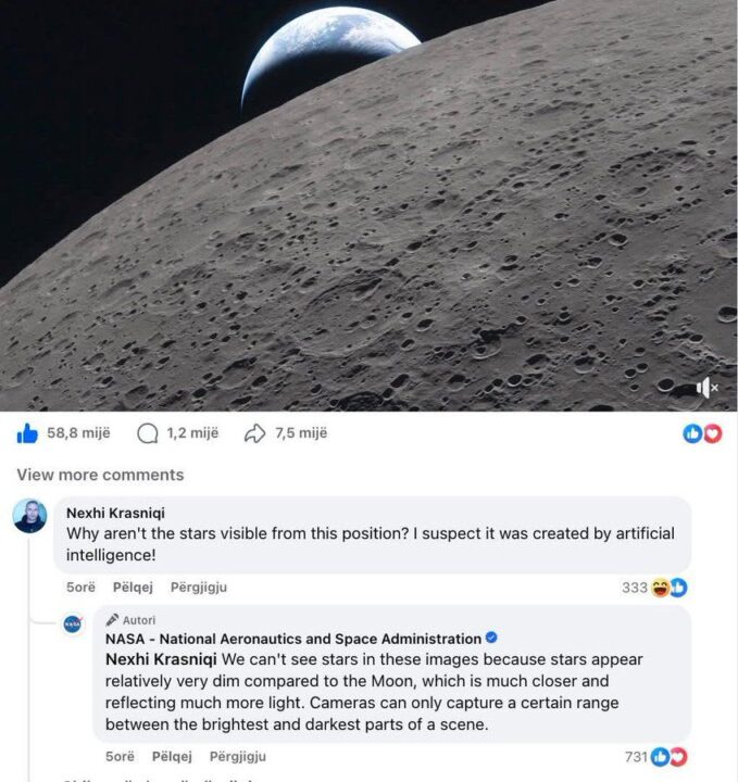 Një bashkëbisedim i pazakontë në rrjetet sociale është bërë viral në orët e fundit, ku në qendër të vëmendjes është një i ri nga Kosova dhe vetë NASA. Gjithçka nisi pas publikimit të disa pamjeve mbresëlënëse nga misioni Artemis II, ku shfaqej ana e pasme e Hënës me Tokën në sfond. Megjithatë, jo të gjithë përdoruesit u bindën për autenticitetin e këtyre imazheve.