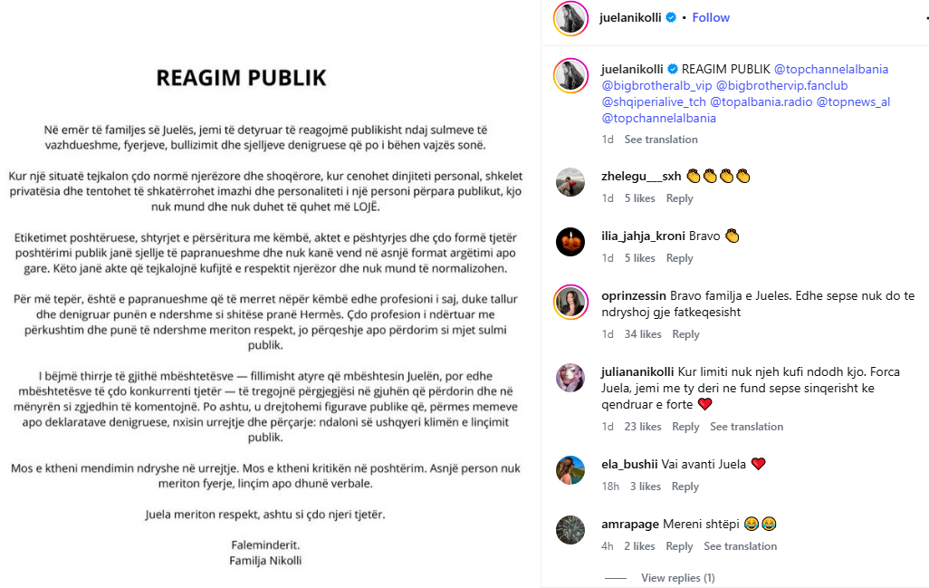 Përmes një reagimi publik në llogarinë zyrtare të Juelës në “Instagram”, familjarët kanë reaguar për sulmet e vazhdueshme, fyerjet, bullizimin dhe sjelljet denigruese ndaj saj.