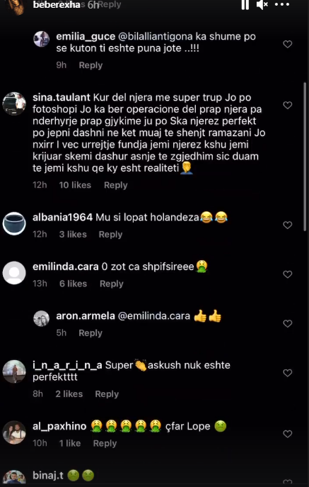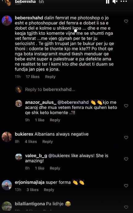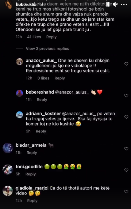 Videon në fjalë e ka publikuar edhe një faqe shqiptare në “Instagram”, ku komentet negative të tipit “si lopë” apo “e shpifur”, i kanë rënë menjëherë në sy Bebe Rexhës. Kjo e fundit i ka ndarë këto komente në “Instastory”-n e saj.