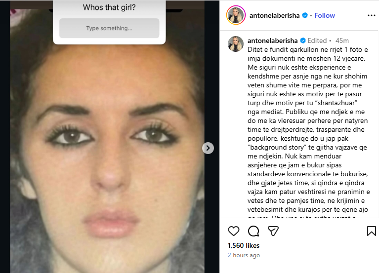 “Publiku më njeh për atë që jam sot, por jo për atë që kam qenë dje. Nuk e bëj këtë postim për shantazhe apo për vëmendje, por për t’u treguar të gjitha vajzave që nuk duhet të kenë turp nga rruga e tyre”, shkruan Berisha, duke hapur një teme rreth pamjes se saj.