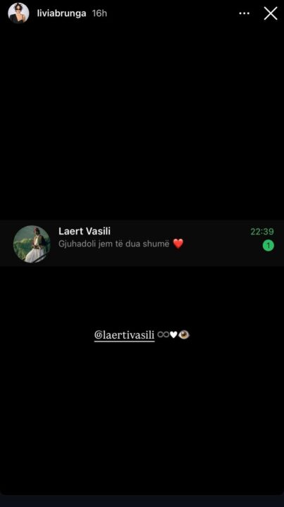 Ndërkohë Livia teksa ka postuar këtë mesazh, e ka etiketuar Laertin dhe krahas emrit të tij ka vendosur edhe emoji të infinitit, zemrës dhe syrit.
