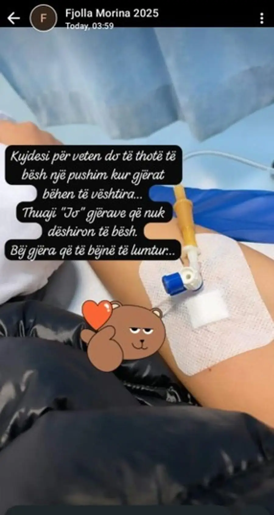 Që nga dita e diel, Fjolla Morina ndodhet nën kujdesin e mjekëve, pasi gjendja e saj shëndetësore kërkoi ndërhyrje të menjëhershme. Lajmi është bërë publik nga vetë këngëtarja, e cila ndau disa imazhe nga një ambient spitalor.