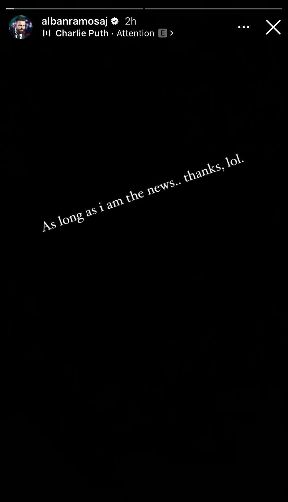 Ardit Çuni nuk ngurroi të jepte kundërpërgjigjen e tij, ndërsa Albani me anë të një Instastory u kundërpërgjigj duke shkruar: “Për sa kohë unë jam lajmi, faleminderit” dhe në sfond dëgjohet kënga që thotë “Ti do vetëm vëmendje”.
