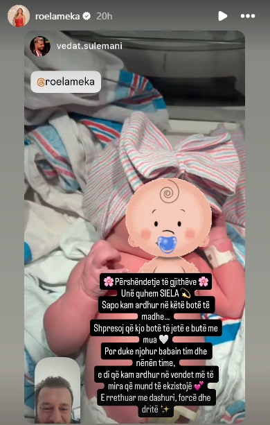Lajmin e ka bërë të ditur partneri i saj, Vedat Sulemani, përmes një postimi në “Instastory”, ku ka publikuar foton e parë të vogëlushes, por duke u kujdesur që të mos e tregojë portretin e saj.