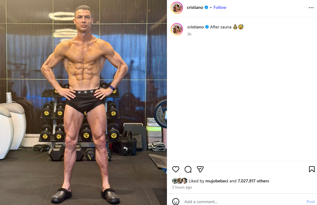 Më 5 shkurt të vitit 2026 Ronaldo do të mbushë 41 vjeç dhe është në formën më të mirë fizike. Foto e postuar sot në “Instagram” ka marrë mbi 7 milionë pëlqime brenda pak orësh.