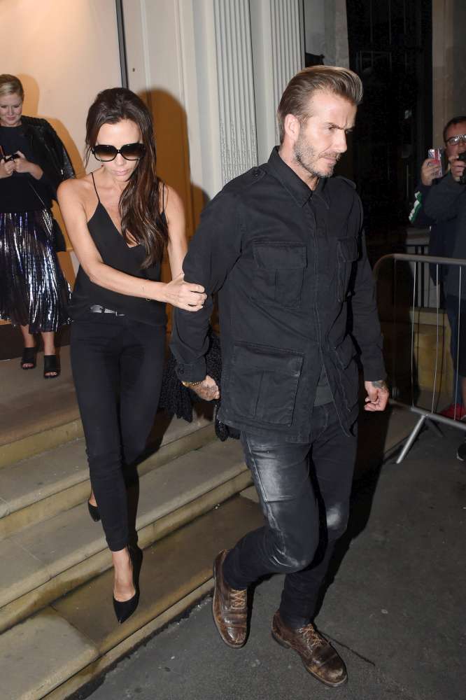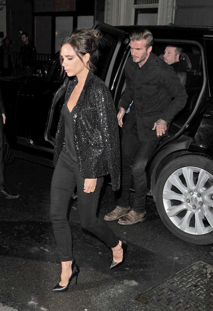 Me pantallona të zeza, bluzë të zezë dhe taka të larta, Victoia duket shumë elegante dhe mbërrin në “Dover Street” për të përuruar “boutique”-n e saj londinez. Kur hyri, shkruajnë mediat britanike, ishte “esëll”, por kur mbaroi ceremonia, ecja e saj ishte e pasigurt, aq sa u detyrua të kapë për krahu Davidin.