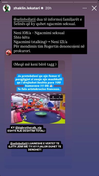 Një tjetër situatë e rëndë ka trazuar Big Brother VIP Albania, pasi gazetarja e njohur, Zhaklin Lekatari ka publikuar pamje që sipas saj përbëjnë një rast të papranueshëm brenda shtëpisë. Në reagimin e saj, ajo ka qenë shumë e drejtpërdrejtë, duke bërë thirrje publike: “Ngacmim seksual. Denoncojeni!”, duke kërkuar që rasti të merret seriozisht dhe të mos anashkalohet.