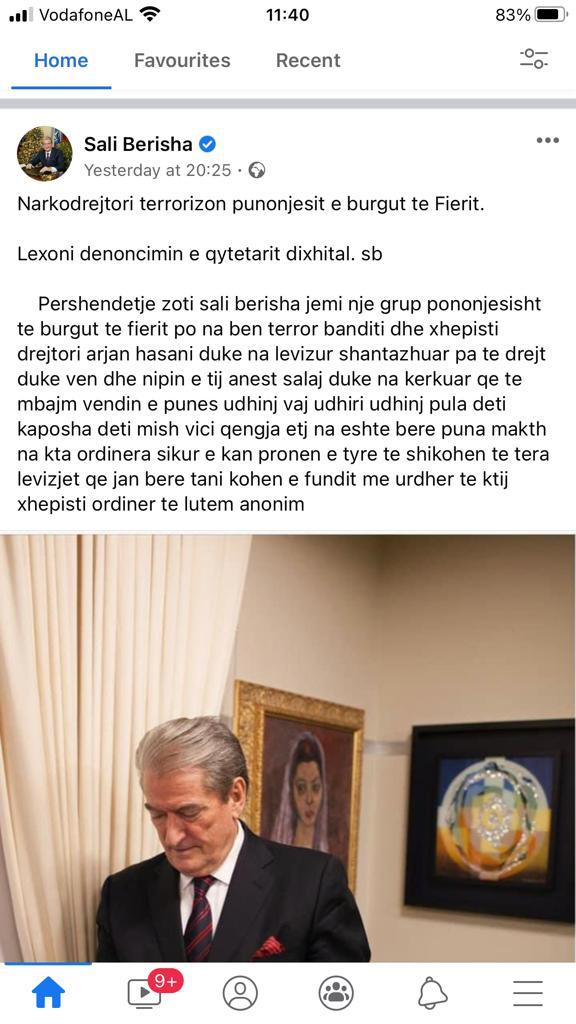 Ish-kryeministri Sali Berisha është i papërmbajtshëm me statuset e tij në rrjetet sociale kundër drejtorit të burgut të Fierit, Arjan Hasani. Në një status të tij më të fundit, Berisha duke iu referuar si përherë qytetarit dixhital denoncon drejtorin e burgut të Fierit për abuzime dhe terror ndaj punonjësve të burgut.