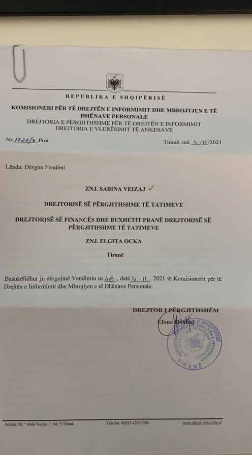 Komisioneri për të Drejtën e Informimit dhe Mbrojtjes së të Dhënave Personale ka gjobitur këtë muaj Drejtorinë e Përgjithshme të Tatimeve me 150 mijë lekë të reja.