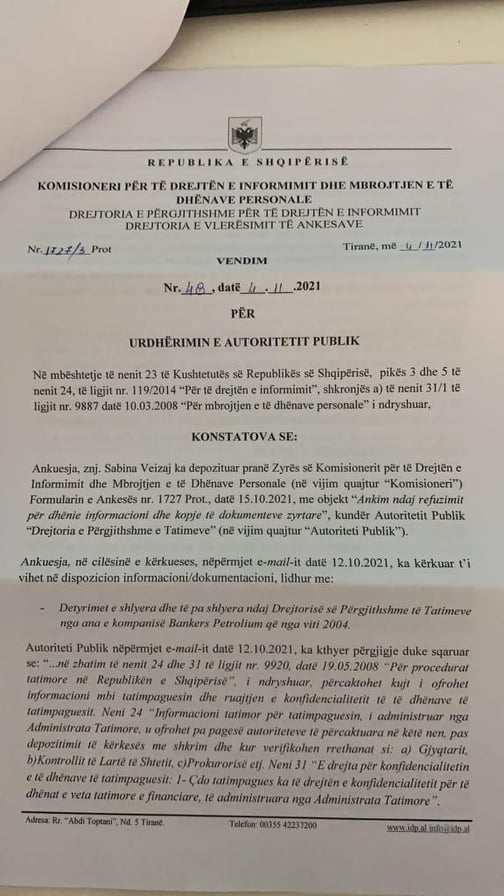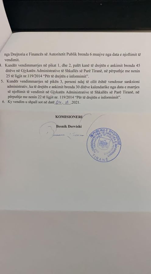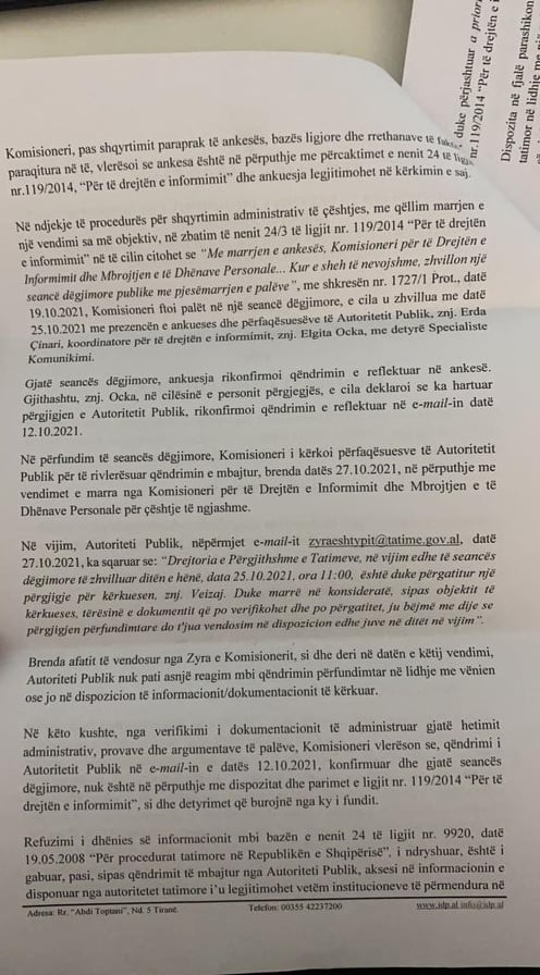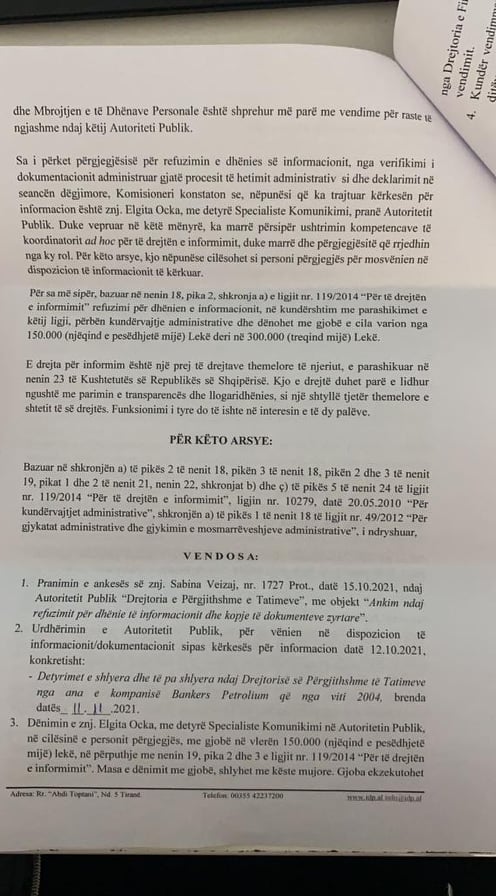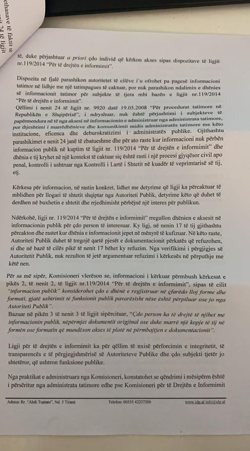 Në letrën e Vendimit të Protokolluar, Komisioneri citon se “Kërkesa për informacion, në rastin konkret, lidhet me detyrime që ligji ka përcaktuar të mblidhen për llogari të shtetit shqiptar nga Autoriteti Publik, detyrime kiëto që nduhet të derdhen në buxhetin e shtetit dhe rrjedhimisht përbëjnë një interes për publikun.