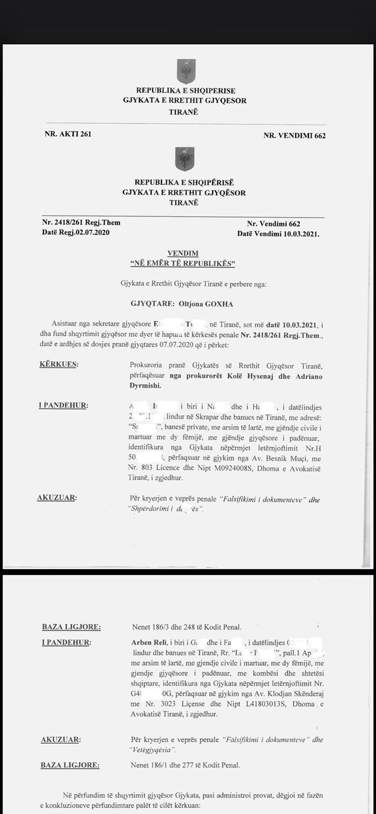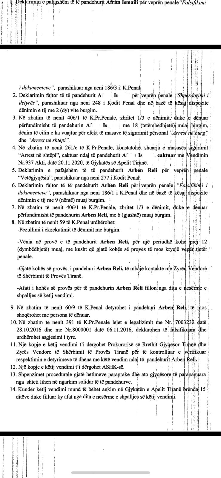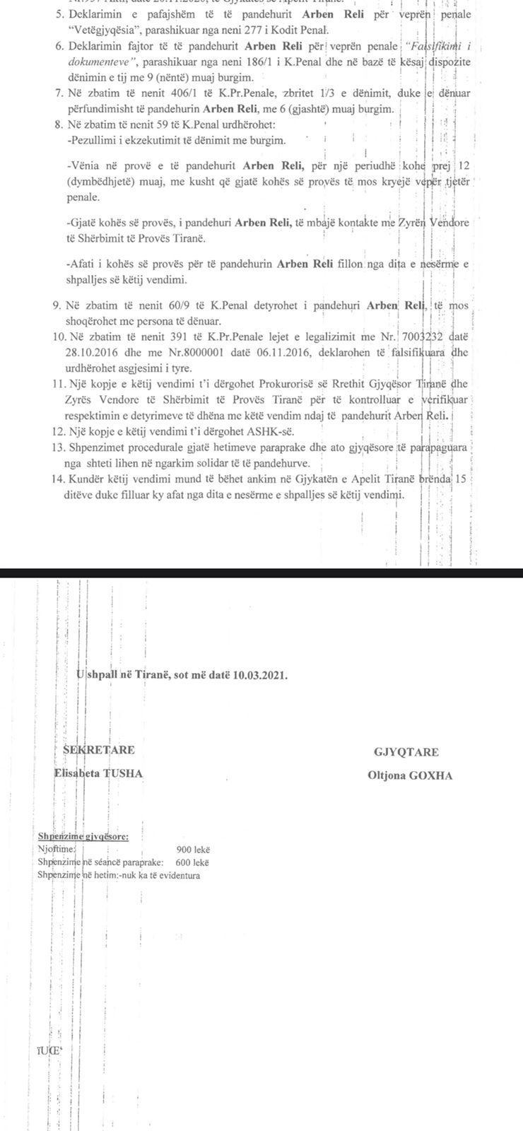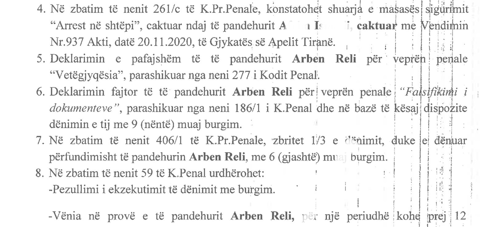 Ndërkohë, në fund, gjykata ka vendosur se “deklarimin fajtor të të pandehurit Arben Reli për veprën penale falsifikimi i dokumenteve” dhe dënimin e tij me 9 muaj burg. I pandehuri ka pranuar gjykimin e shkurtuar dhe në fund është dënuar me 6 muaj burg.