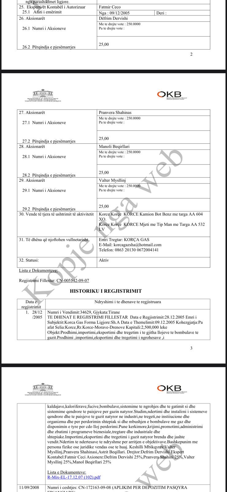 Dokument: Sipas ekstraktit të QKB-së, zonja Pranvera Shahinasi ka 20 % të aksioneve të firma Korça Gas